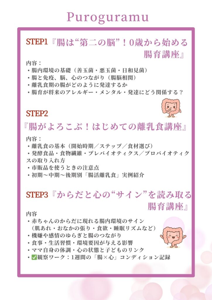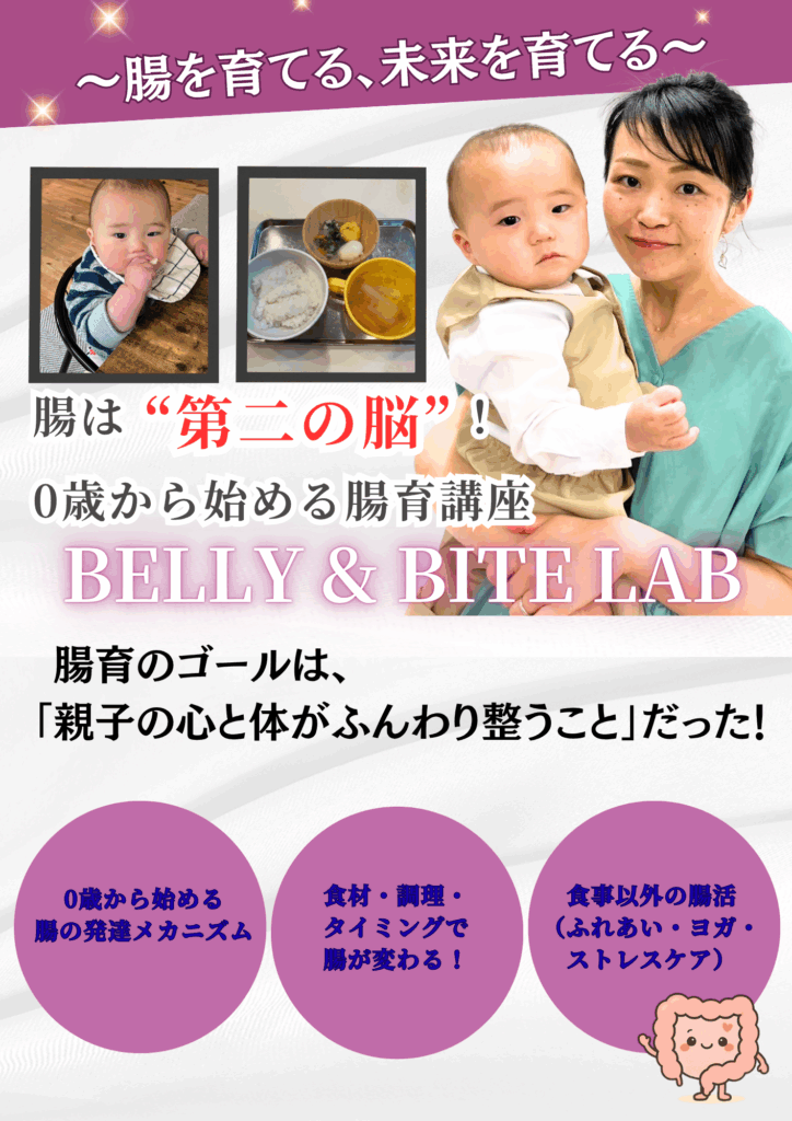 現在は、自身の子育て経験、保育園栄養士経験を踏まえ、子育て世代のママ達に「腸にやさしい離乳食講座」を提供しています。